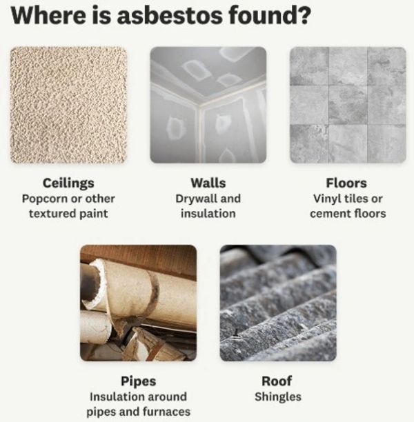 Asbestos can be found in flooring, joint compound, drywall, textured/popcorn ceiling, insulation, pipe insulation, roofing materials.